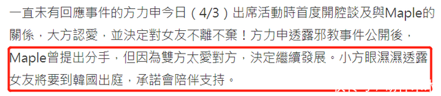 络续词跟着方力申女友身份被扒,她的过往也一并被曝光,牵连出了一段不忍回首的过往——出身于1994年的Maple,比喻力申小14岁,高中期间她被指引加入邪教,2013年,年仅20岁的Maple独身赶赴韩国,成为了所谓“明星”。